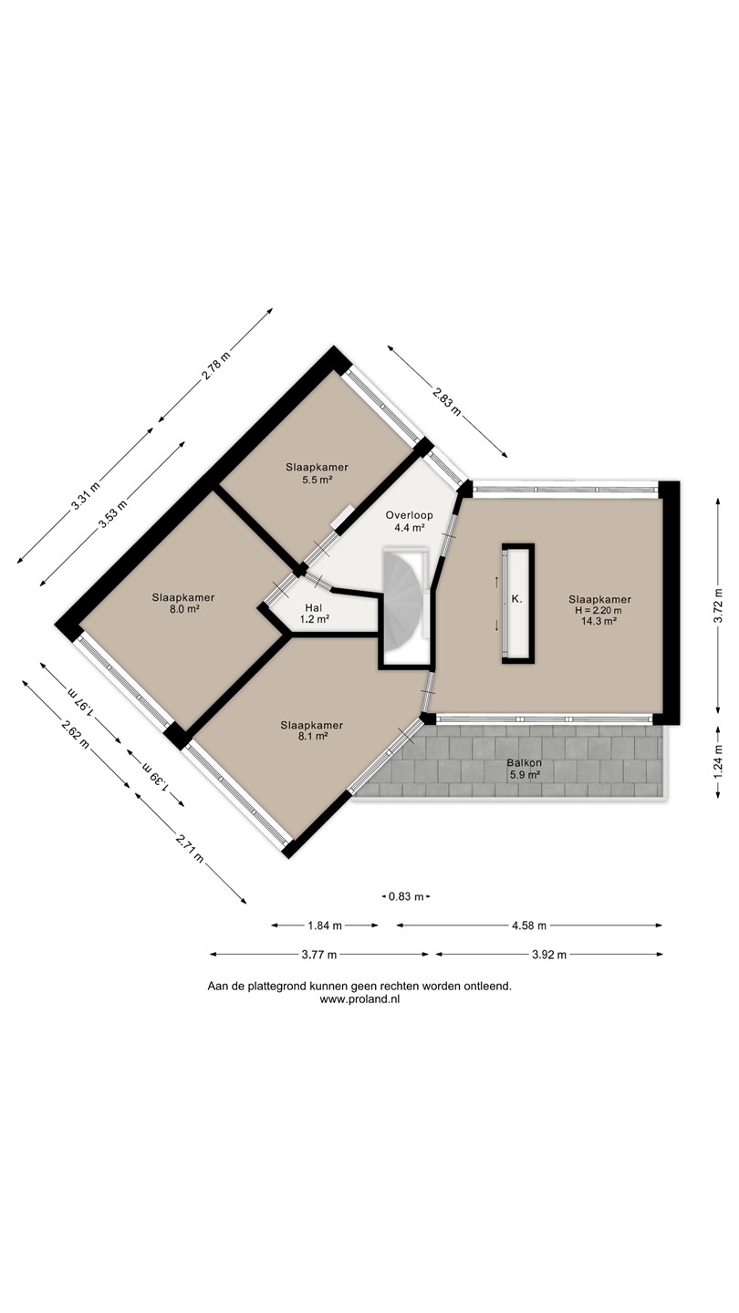 De 4 slaapkamers zijn bereikbaar vanuit de woonkamer via de wenteltrap.