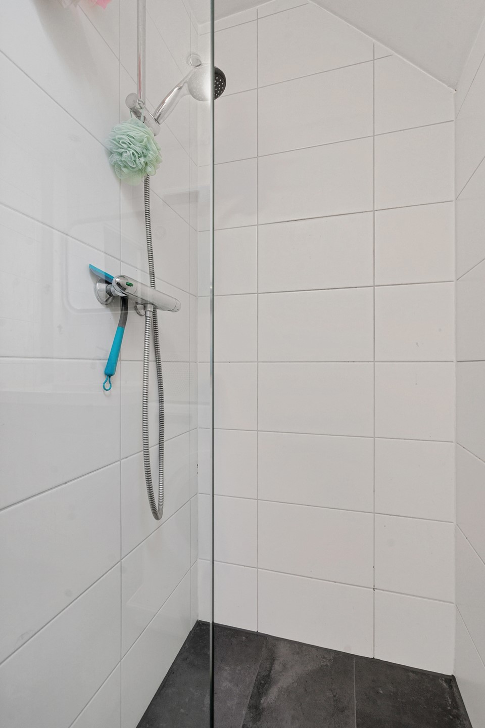 De badkamer is voorzien van een wastafelmeubel, douche en aansluiting voor de was/droogcombinatie.