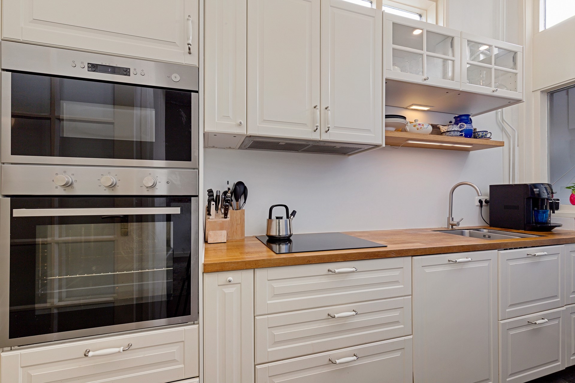 Aan de achterzijde bevindt zich de keuken voorzien van alle relevante apparatuur, koelkast, vriezer, combi-magnetron, vaatwasser, oven, afzuigkap en inductie kookplaat.